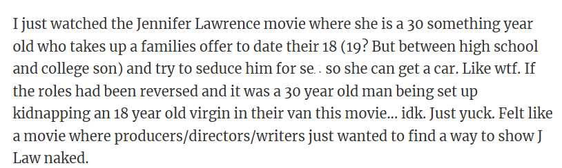 "Passengers, and if you can't tell that Chris Pratt is absolutely evil in that movie, you're definitely not safe to be around. And tbh, I've heard the "he picked the wrong girl obviously " argument, and it also reeks of predatory male privilege."