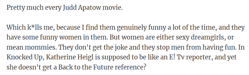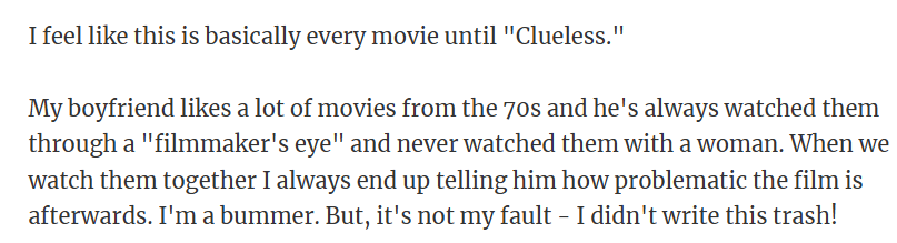 "I watched the first few minutes of American Pie: Girls Rules and turned it off because it was so blatantly written by men and i was not about to subject myself to an hour and a half of a stupid movie written by stupid men about ***adolescent female sexuality***. like, just f**k no. i didn't even bother with googling the writers, it was THAT obvious. a critic also said the same thing."